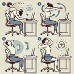 - 1時間ごとに5分程度の休憩を取り、首を軽く回したり伸ばしたりする。例えば、首を前後左右にゆっくり倒したり、肩をすくめてストンと落とす動作を取り入れると効果的。